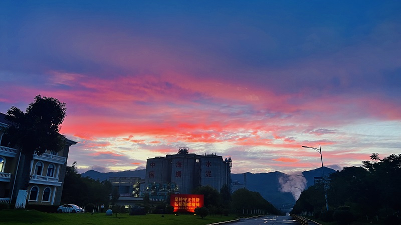 “綠樹青山帶晚霞,樹間處處有人家”是明代王直《題畫》中對(duì)于晚霞美景的描繪。綠樹、青山、晚霞,還有林間的人家,組成了一副閑適、恬靜的畫面。紅霞漫天、余暉鋪灑,此刻,自然與人文的和諧之美在海螺水泥的工廠中更顯意味。
