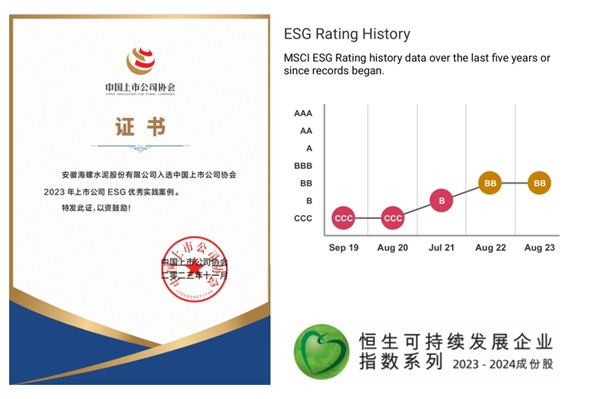 近年來,公司積極貫徹國家“雙碳”戰(zhàn)略,探索ESG創(chuàng)新發(fā)展,得到了國際國內(nèi)多方認(rèn)可。國際知名評級機構(gòu)MSCI對公司ESG評級提升至“BB”;今年9月海螺水泥被納入恒生可持續(xù)發(fā)展企業(yè)指數(shù)系列成分股;在近日中國上市公司協(xié)會發(fā)布的評選結(jié)果中,海螺水泥入選“2023年上市公司ESG優(yōu)秀實踐案例”。