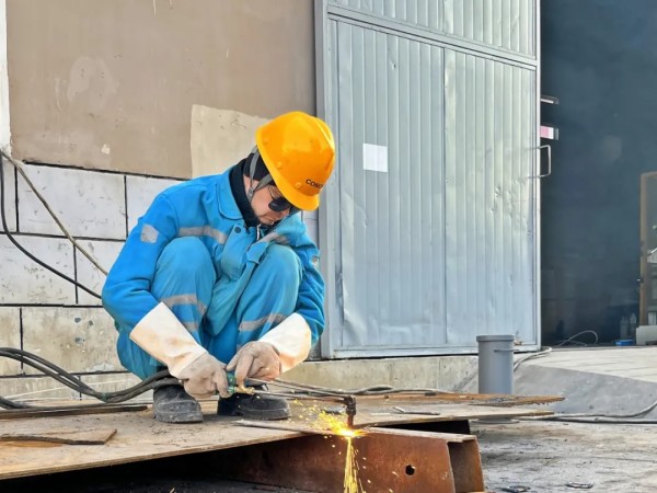 卡爾希海螺維修工貝克正在進(jìn)行鋼材下料作業(yè),他說(shuō):“Payvandchi qo‘lidagi yong‘in – uskunaning barqaror ishlashining kafolati.(用我手中的焊槍,保障設(shè)備穩(wěn)定運(yùn)行)”
