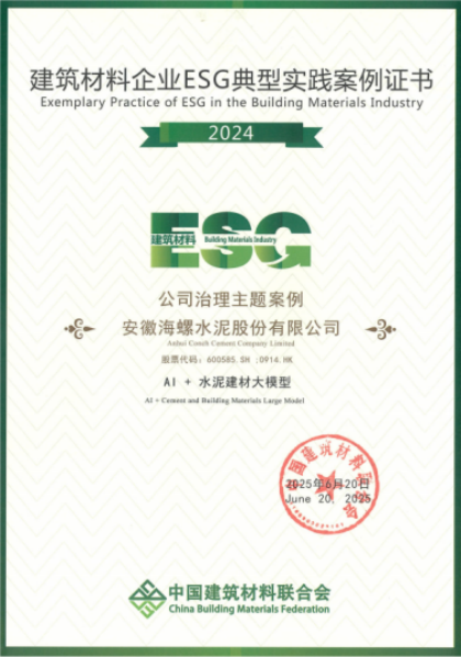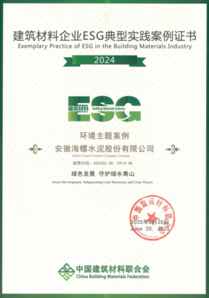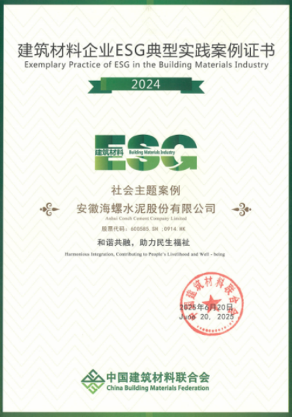 論壇發(fā)布了建筑材料行業(yè)ESG評級,該評級融合國內(nèi)外主流框架,確定13項行業(yè)議題,明確122項關(guān)鍵績效指標,科學衡量公司發(fā)展韌性。本次評級覆蓋131家建筑材料公司,共15家公司榮獲A+評級。同時發(fā)布了2024年度建筑材料行業(yè)ESG典型實踐案例,涵蓋環(huán)境、社會、公司治理以及氣候變化4項專題下各5個實踐案例。海螺水泥憑借卓越的ESG治理和實踐,榮獲建筑材料行業(yè)A+評級,并入選環(huán)境、社會、治理3項專題實踐案例。此外,公司應(yīng)邀在論壇上進行了以《踐行“雙碳”戰(zhàn)略,引領(lǐng)綠色發(fā)展》為主題的ESG實踐經(jīng)驗分享。