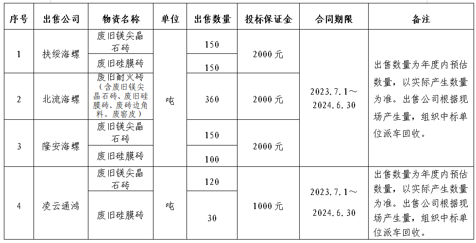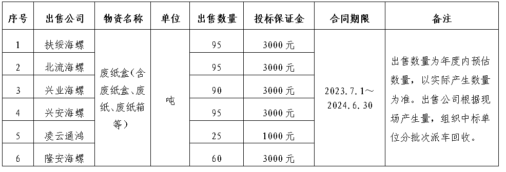 為規(guī)范區(qū)域內(nèi)各公司自動(dòng)插袋包裝機(jī)所用自動(dòng)袋外包裝紙盒(簡稱:廢紙盒)、廢舊耐火磚出售管理,保證廢紙盒、廢舊耐火磚出售過程的公開、公平、公正,擬開展廣西區(qū)域2023-2024年度廢紙盒、廢舊耐火磚出售招標(biāo)工作,現(xiàn)將招標(biāo)信息公示如下: