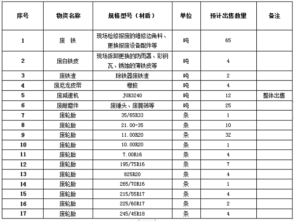 根據(jù)公司現(xiàn)場實際情況,本著“公開、公平、公正、誠實信用和競爭、擇優(yōu)”原則,濟寧海螺水泥有限責任公司擬開展廢舊物資公開招標,歡迎具備條件的單位參加,現(xiàn)將有關事項公示如下: