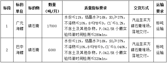 3.新渠道需經(jīng)招標(biāo)人實(shí)地調(diào)研取樣化驗(yàn)合格后方可參與投標(biāo),除化學(xué)指標(biāo)外,招標(biāo)人需對(duì)新渠道磷石膏凝結(jié)時(shí)間進(jìn)行檢測(cè),其中廣元海螺要求在PO42.5R小磨實(shí)驗(yàn)中終凝時(shí)間不高于320min,巴中海螺要求在PO42.5R小磨實(shí)驗(yàn)中終凝時(shí)間不高于360min。